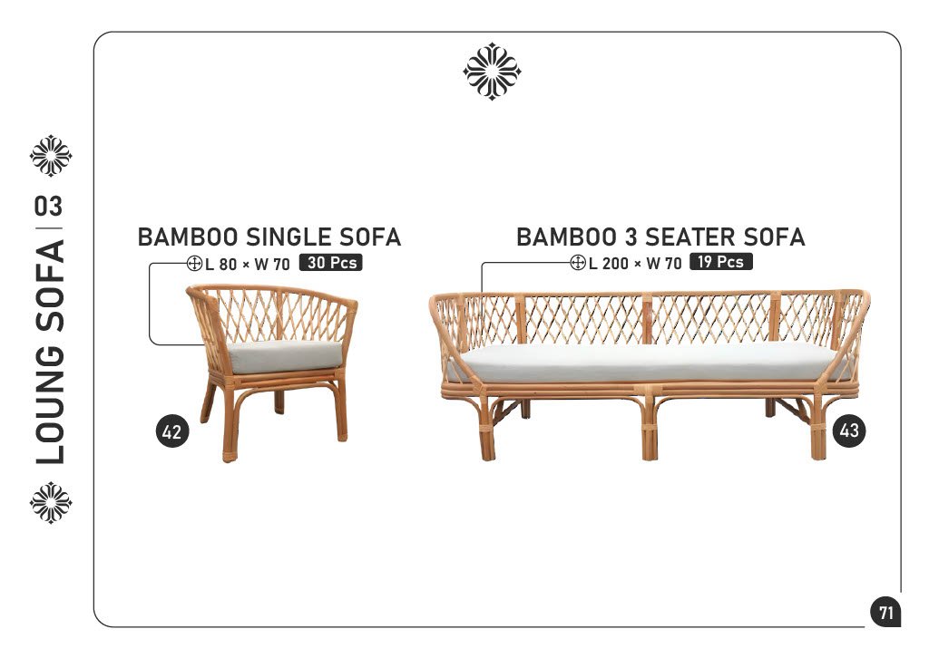 42) BAMBOO SINGLE SOFA — L80 × W70 — 30 pcs 43) BAMBOO 3 SEATER SOFA — L200 × W70 — 19 pcs