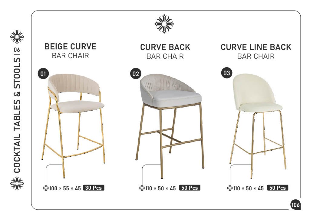 01) BEIGE CURVE BAR CHAIR โ€” 100 ร— 55 ร— 45 cm โ€” 30 pcs 02) CURVE BACK BAR CHAIR โ€” 110 ร— 50 ร— 45 cm โ€” 50 pcs 03) CURVE LINE BACK BAR CHAIR โ€” 110 ร— 50 ร— 45 cm โ€” 50 pcs