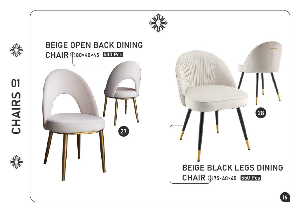 27) BEIGE OPEN BACK DINING CHAIR — 80×40×45 — 500 pcs 28) BEIGE BLACK LEGS DINING CHAIR — 75×40×45 — 550 pcs