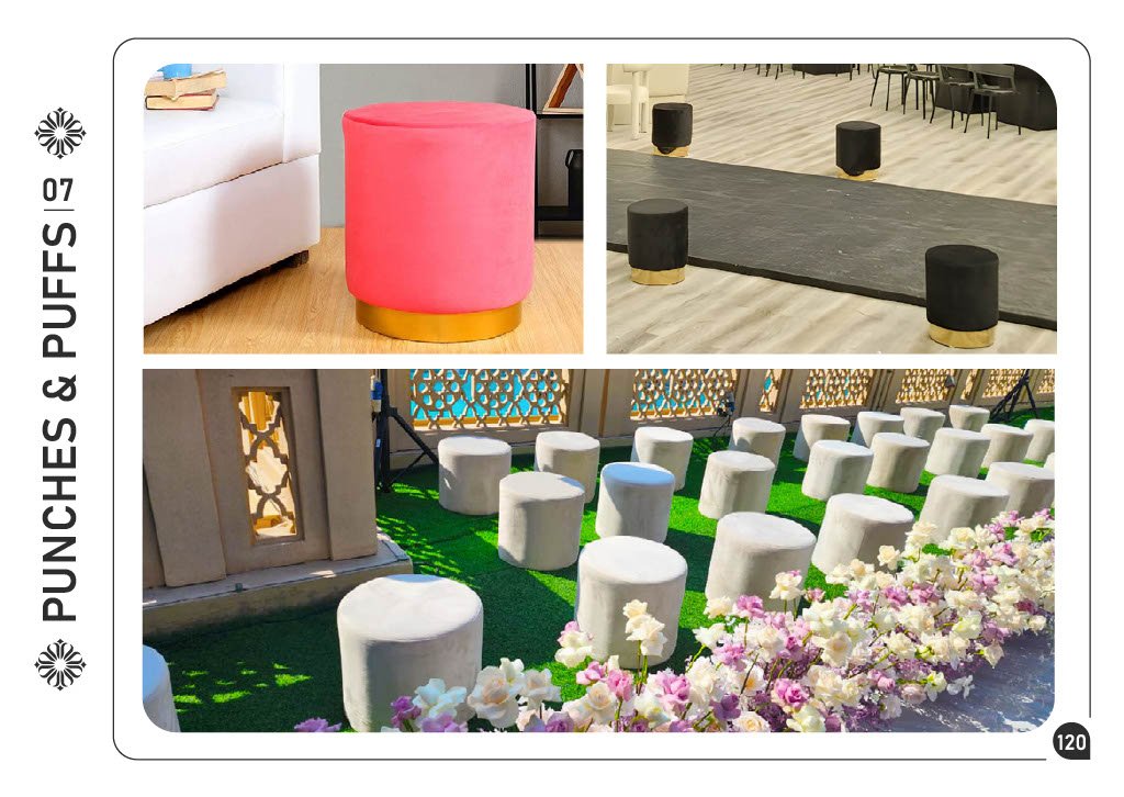 Colorful and versatile seating puffs for lounges, weddings, and outdoor events.