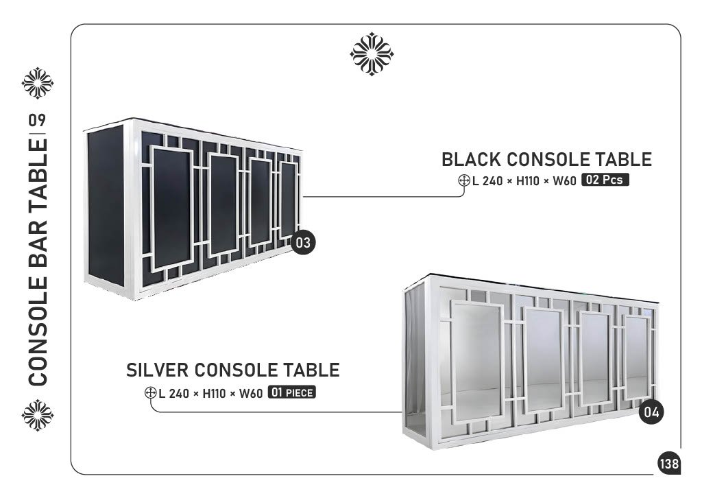 03) Black Console Table — L240 × H110 × W60 — 2 pcs 04) Silver Console Table — L240 × H110 × W60 — 1 pc