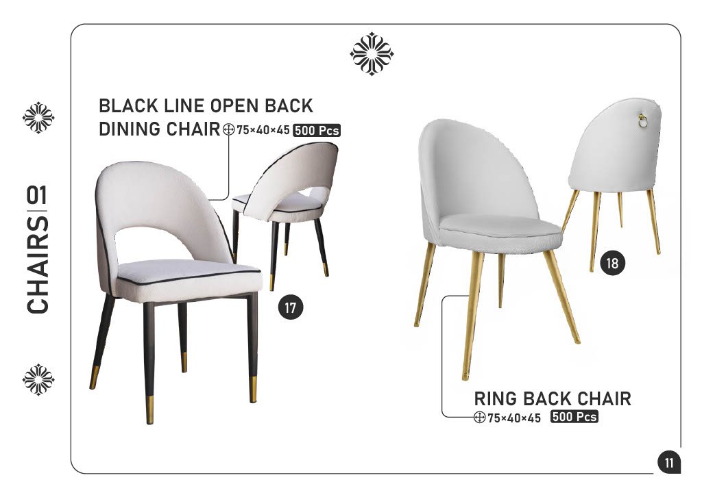 17) BLACK LINE OPEN BACK DINING CHAIR — 75×40×45 — 500 pcs 18) RING BACK CHAIR — 75×40×45 — 500 pcs