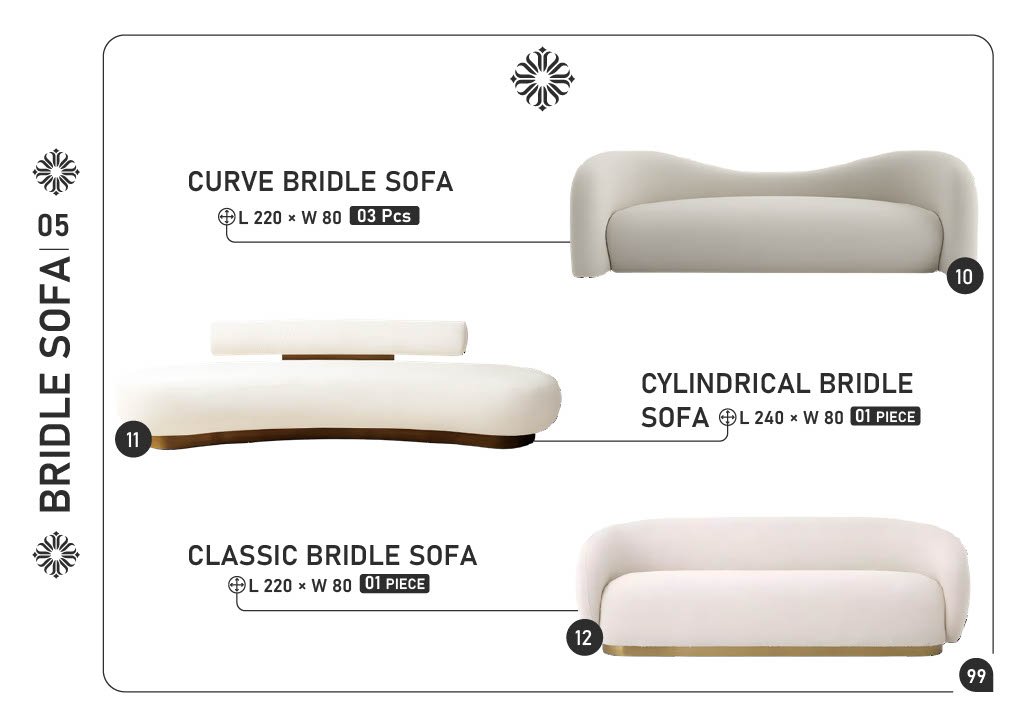 10) CURVE BRIDLE SOFA โ L 220 ร W 80 โ 3 pcs 11) CYLINDRICAL BRIDLE SOFA โ L 240 ร W 80 โ 1 piece 12) CLASSIC BRIDLE SOFA โ L 220 ร W 80 โ 1 piece