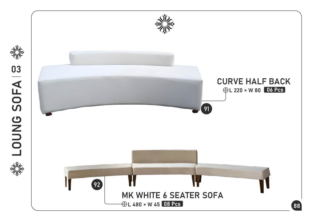 91) CURVE HALF BACK — L220 × W80 — 6 pcs 92) MK WHITE 6 SEATER SOFA — L480 × W45 — 8 pcs