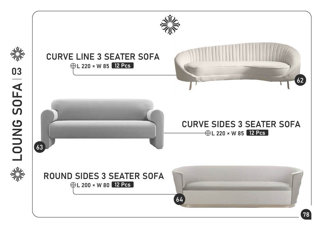 62) CURVE LINE 3 SEATER SOFA โ L220 ร W85 โ 12 pcs 63) CURVE SIDES 3 SEATER SOFA โ L220 ร W85 โ 12 pcs 64) ROUND SIDES 3 SEATER SOFA โ L200 ร W80 โ 12 pcs