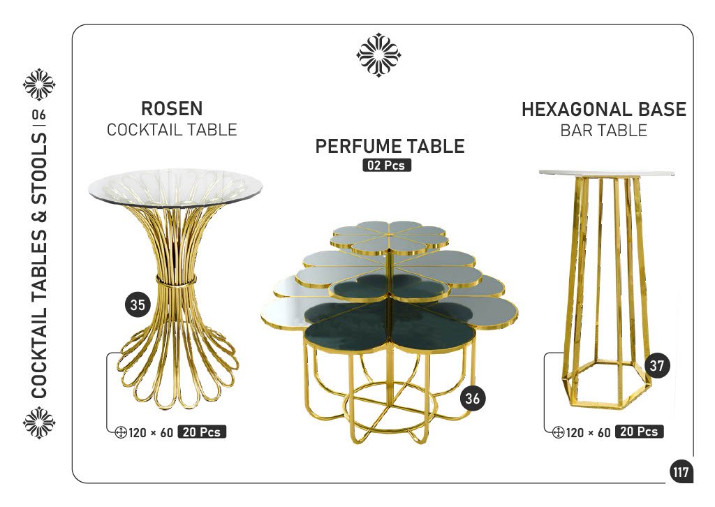35) ROSEN COCKTAIL TABLE โ€” 120 ร— 60 cm โ€” 20 pcs 36) PERFUME TABLE โ€” Custom floral tiered design โ€” 2 pcs 37) HEXAGONAL BASE BAR TABLE โ€” 120 ร— 60 cm โ€” 20 pcs