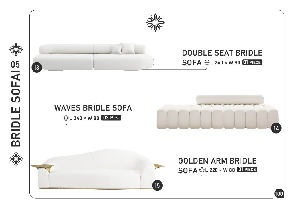 13) DOUBLE SEAT BRIDLE SOFA β L 240 Γ W 80 β 1 piece 14) WAVES BRIDLE SOFA β L 240 Γ W 80 β 3 pcs 15) GOLDEN ARM BRIDLE SOFA β L 220 Γ W 80 β 1 piece