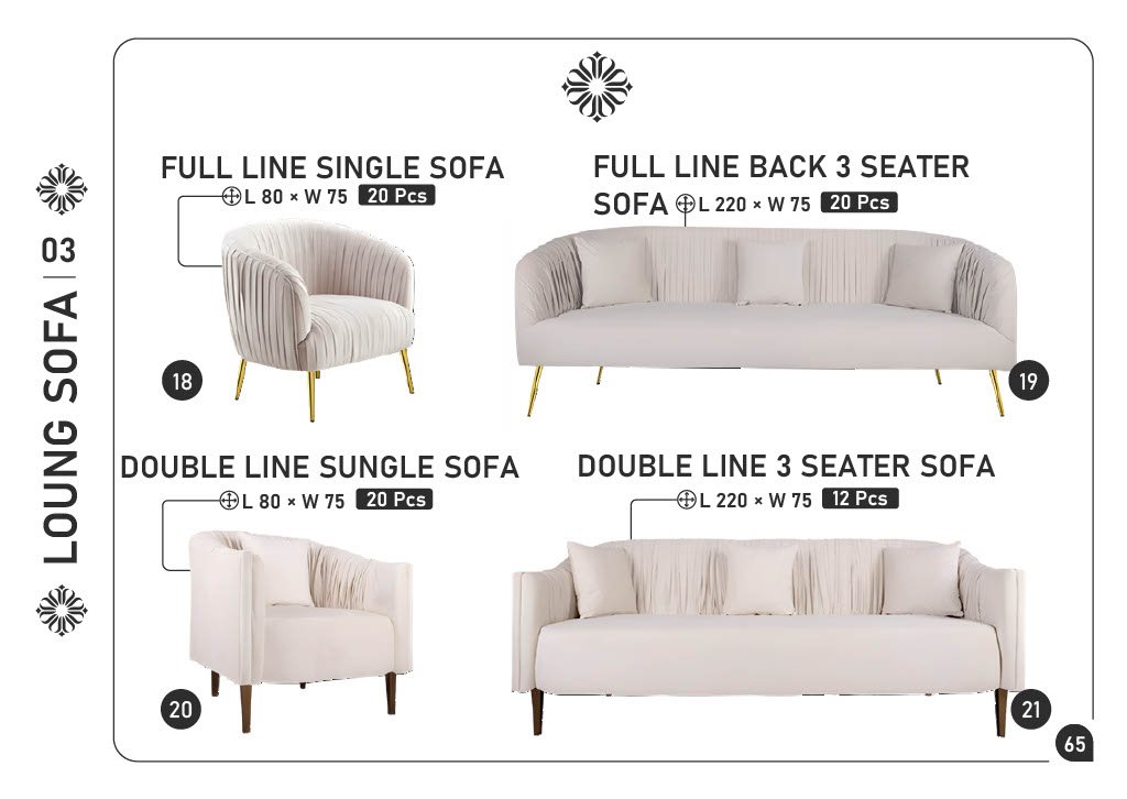 18) FULL LINE SINGLE SOFA β€” L80 Γ— W75 β€” 20 pcs 19) FULL LINE BACK 3 SEATER SOFA β€” L220 Γ— W75 β€” 20 pcs 20) DOUBLE LINE SINGLE SOFA β€” L80 Γ— W75 β€” 20 pcs 21) DOUBLE LINE 3 SEATER SOFA β€” L220 Γ— W75 β€” 12 pcs