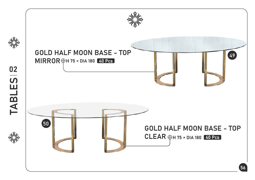 49) GOLD HALF MOON BASE – TOP MIRROR — H75×DIA180 — 40 pcs 50) GOLD HALF MOON BASE – TOP CLEAR — H75×DIA180 — 40 pcs
