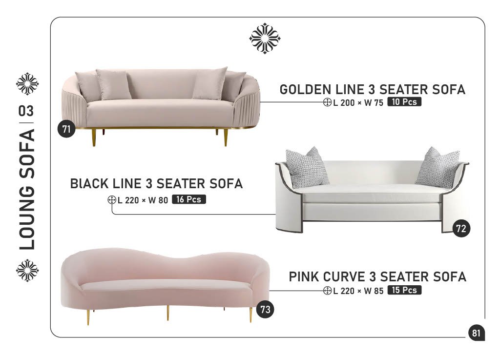 71) GOLDEN LINE 3 SEATER SOFA โ L200 ร W75 โ 10 pcs 72) BLACK LINE 3 SEATER SOFA โ L220 ร W80 โ 16 pcs 73) PINK CURVE 3 SEATER SOFA โ L220 ร W85 โ 15 pcs