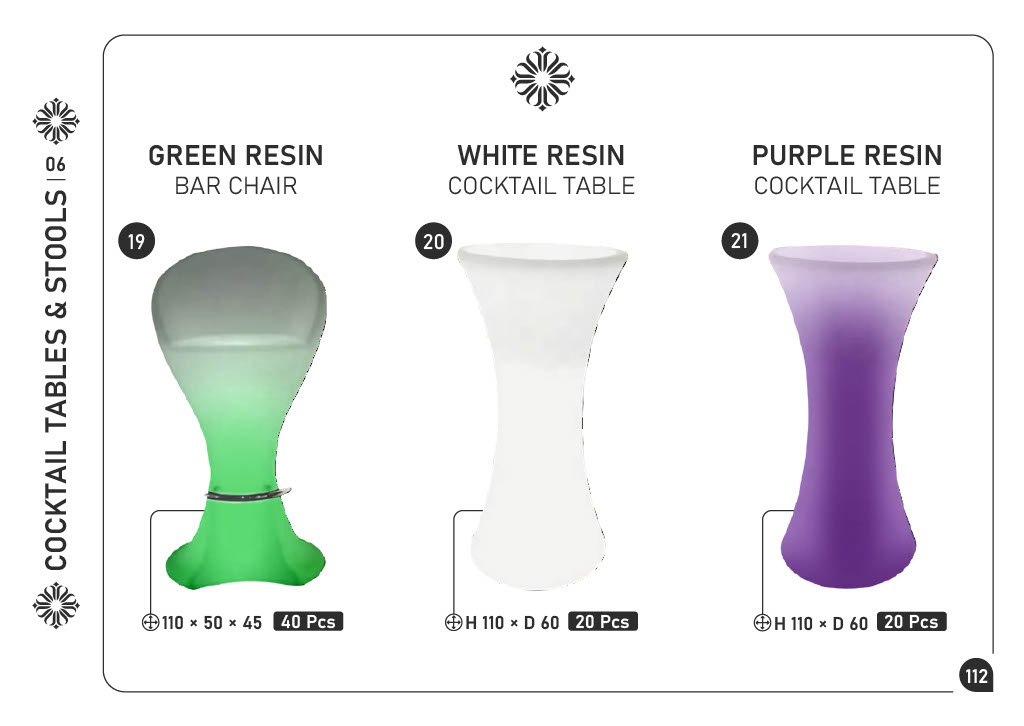 19) GREEN RESIN BAR CHAIR โ€” 110 ร— 50 ร— 45 cm โ€” 40 pcs 20) WHITE RESIN COCKTAIL TABLE โ€” H 110 ร— D 60 cm โ€” 20 pcs 21) PURPLE RESIN COCKTAIL TABLE โ€” H 110 ร— D 60 cm โ€” 20 pcs