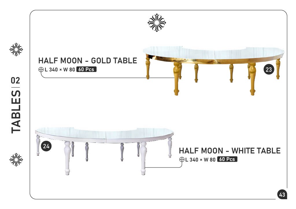 Add to cartHalf-moon mirrored tables available in gold and white versions, perfect for curved head table arrangements.