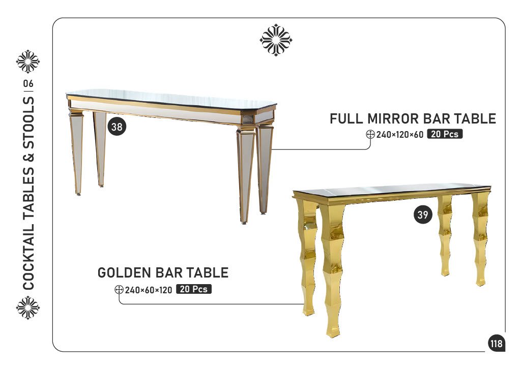 38) FULL MIRROR BAR TABLE — 240 × 120 × 60 cm — 20 pcs 39) GOLDEN BAR TABLE — 240 × 60 × 120 cm — 20 pcs