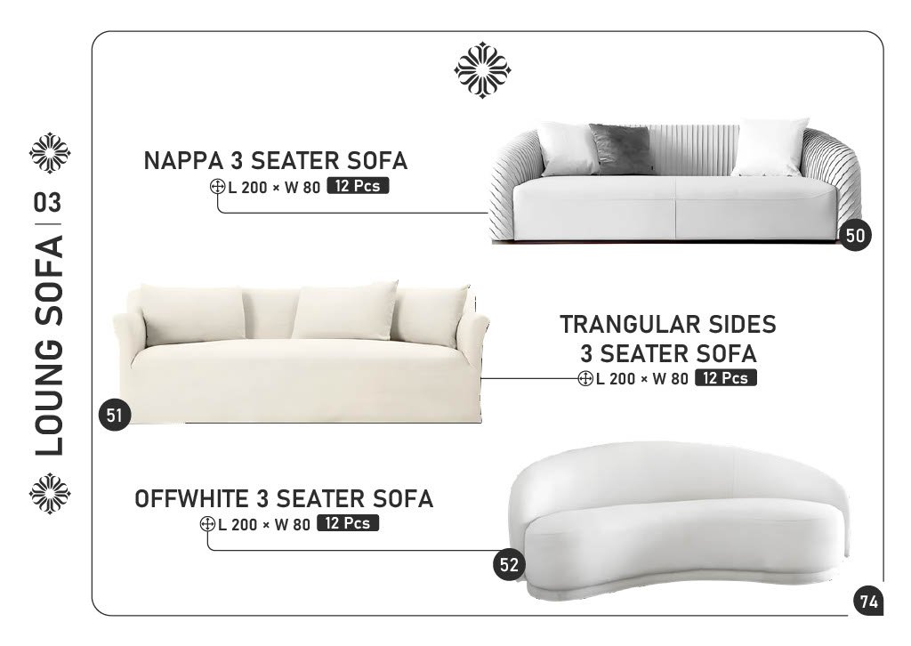 50) NAPPA 3 SEATER SOFA โ L200 ร W80 โ 12 pcs 51) TRIANGULAR SIDES 3 SEATER SOFA โ L200 ร W80 โ 12 pcs 52) OFFWHITE 3 SEATER SOFA โ L200 ร W80 โ 12 pcs