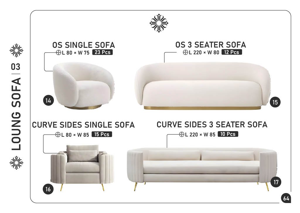 14) OS SINGLE SOFA β L80 Γ W75 β 23 pcs 15) OS 3 SEATER SOFA β L220 Γ W80 β 12 pcs 16) CURVE SIDES SINGLE SOFA β L80 Γ W85 β 15 pcs 17) CURVE SIDES 3 SEATER SOFA β L220 Γ W85 β 10 pcs