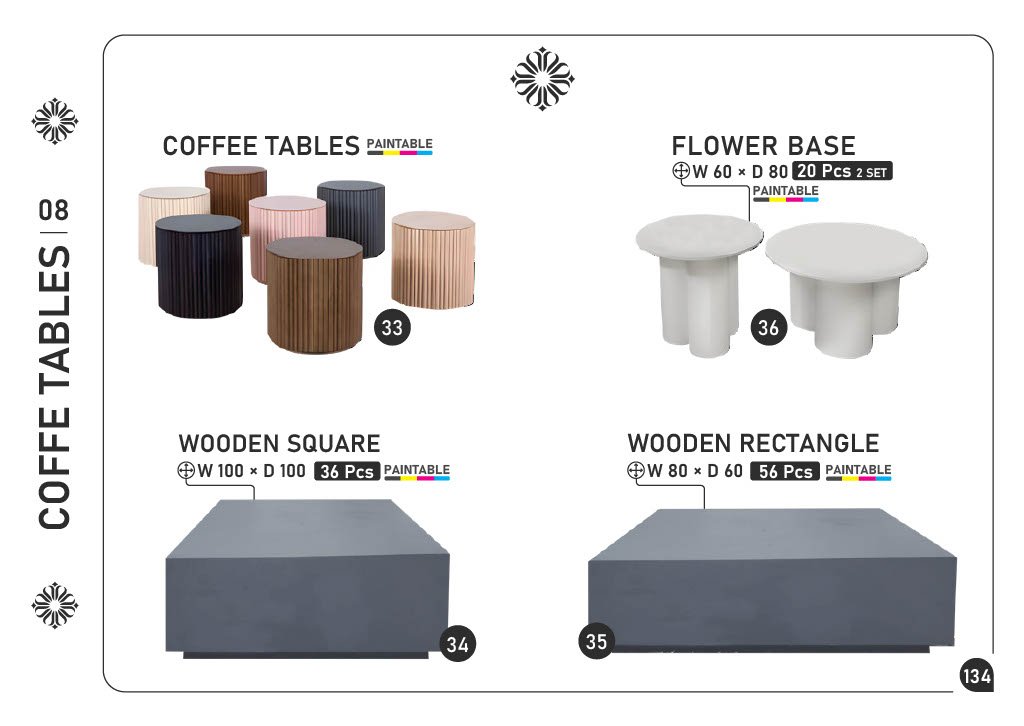 33 Coffee Tables (assorted colors) โ€” Paintable 34 Wooden Square โ€” W100 ร— D100 cm โ€” 36 pcs (Paintable) 35 Wooden Rectangle โ€” W80 ร— D60 cm โ€” 56 pcs (Paintable) 36 Flower Base โ€” W60 ร— D80 cm โ€” 20 pcs (2 set Paintable)