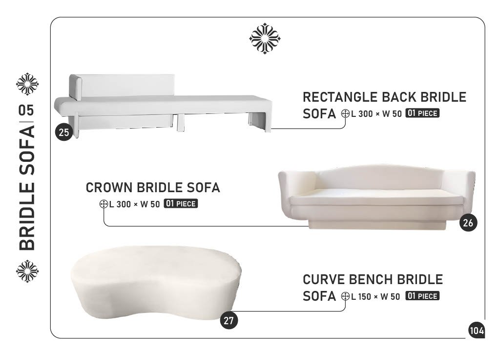 25) RECTANGLE BACK BRIDLE SOFA β€” L 300 Γ— W 50 β€” 1 piece 26) CROWN BRIDLE SOFA β€” L 300 Γ— W 50 β€” 1 piece 27) CURVE BENCH BRIDLE SOFA β€” L 150 Γ— W 50 β€” 1 piece