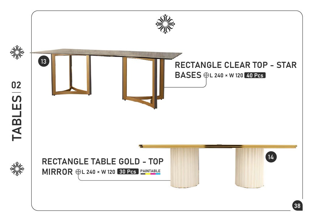 13) RECTANGLE CLEAR TOP – STAR BASES — L240×W120 — 40 pcs 14) RECTANGLE TABLE GOLD – TOP MIRROR (PAINTABLE) — L240×W120 — 30 pcs