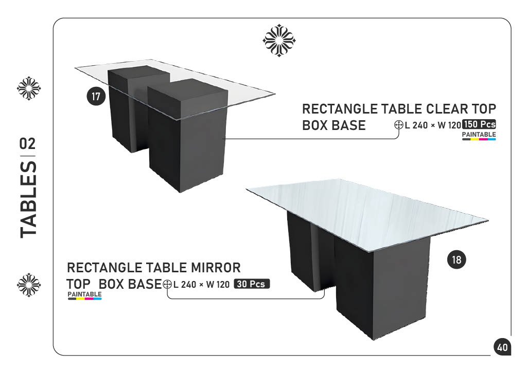 17) RECTANGLE TABLE CLEAR TOP BOX BASE β L240ΓW120 β 150 pcs β PAINTABLE 18) RECTANGLE TABLE MIRROR TOP BOX BASE β L240ΓW120 β 30 pcs β PAINTABLE