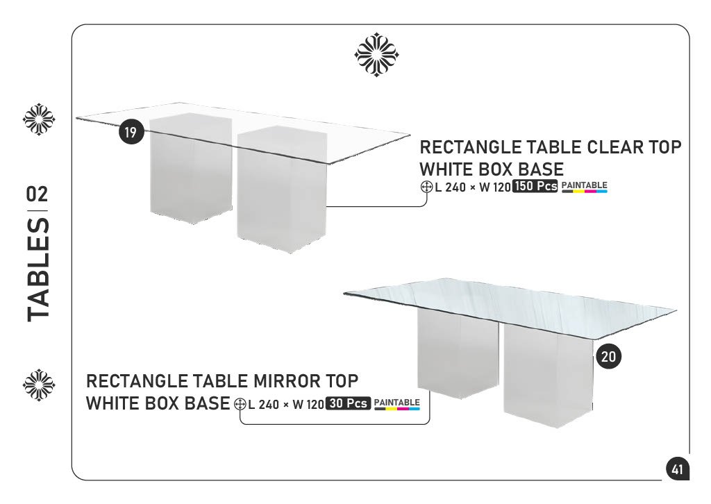 19) RECTANGLE TABLE CLEAR TOP WHITE BOX BASE β L240ΓW120 β 150 pcs β PAINTABLE 20) RECTANGLE TABLE MIRROR TOP WHITE BOX BASE β L240ΓW120 β 30 pcs β PAINTABLE