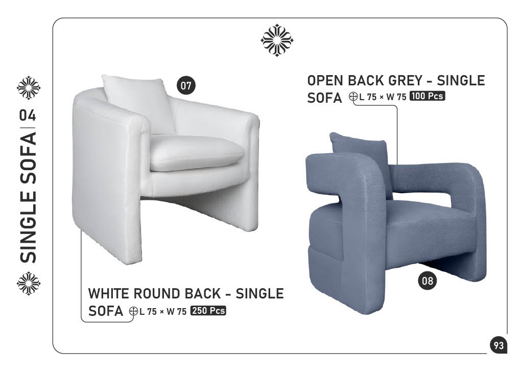 07) WHITE ROUND BACK SINGLE SOFA — L75 × W75 — 250 pcs 08) OPEN BACK GREY SINGLE SOFA — L75 × W75 — 100 pcs