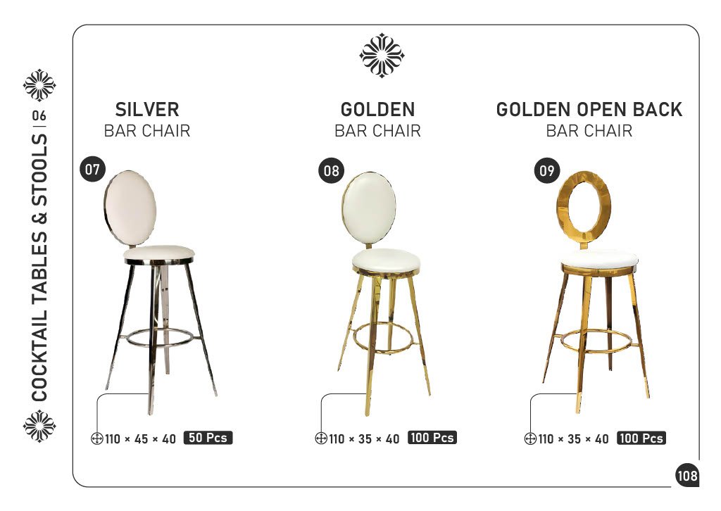 07) SILVER BAR CHAIR โ 110 ร 45 ร 40 cm โ 50 pcs 08) GOLDEN BAR CHAIR โ 110 ร 35 ร 40 cm โ 100 pcs 09) GOLDEN OPEN BACK BAR CHAIR โ 110 ร 35 ร 40 cm โ 100 pcs
