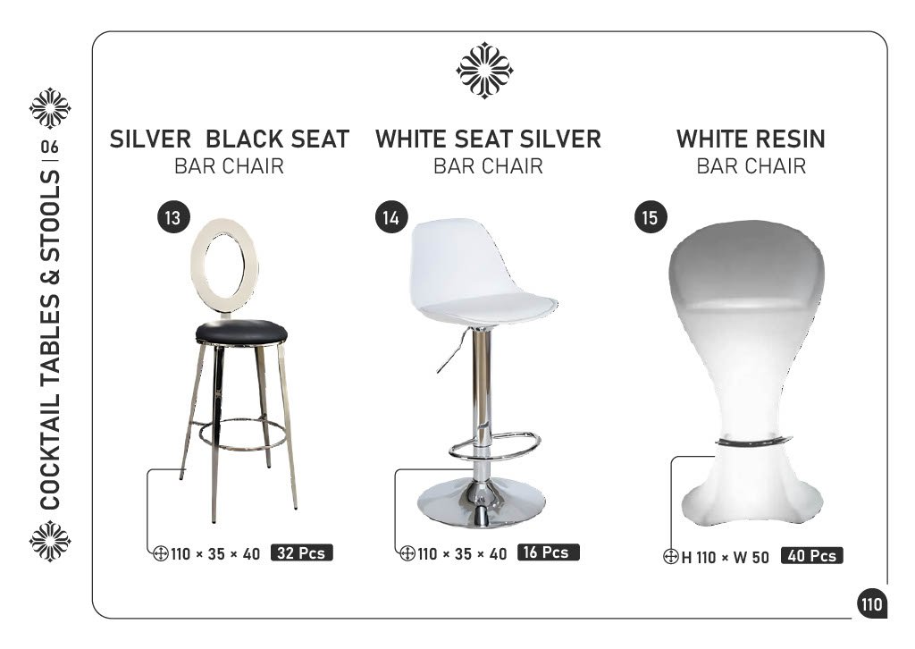 13) SILVER BLACK SEAT BAR CHAIR โ 110 ร 35 ร 40 cm โ 32 pcs 14) WHITE SEAT SILVER BAR CHAIR โ 110 ร 35 ร 40 cm โ 16 pcs 15) WHITE RESIN BAR CHAIR โ H 110 ร W 50 cm โ 40 pcs