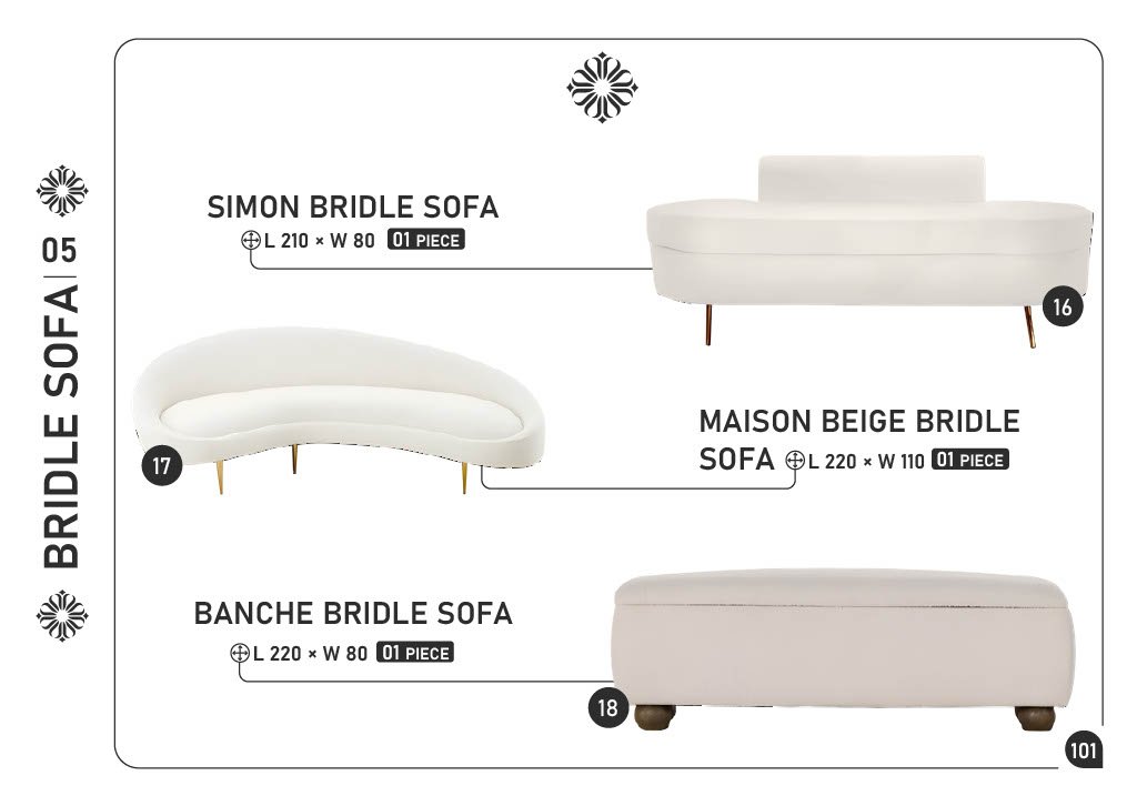 16) SIMON BRIDLE SOFA โ L 210 ร W 80 โ 1 piece 17) MAISON BEIGE BRIDLE SOFA โ L 220 ร W 110 โ 1 piece 18) BANCHE BRIDLE SOFA โ L 220 ร W 80 โ 1 piece