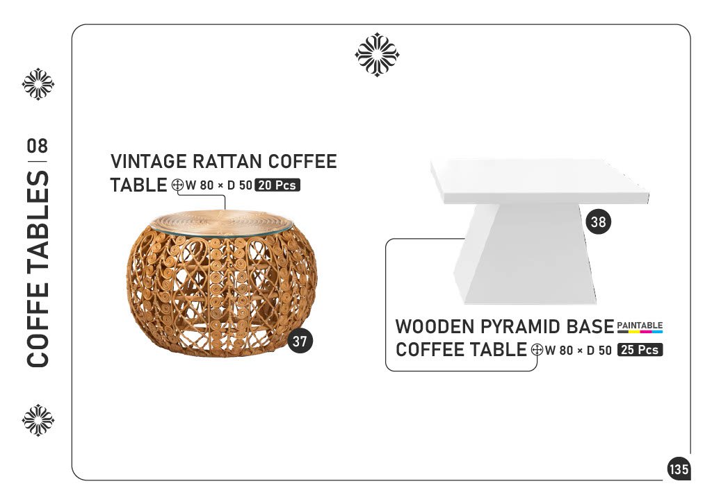 37) Vintage Rattan Coffee Table — W80 × D50 cm — 20 pcs 38) Wooden Pyramid Base Coffee Table — W80 × D50 cm — 25 pcs (Paintable)