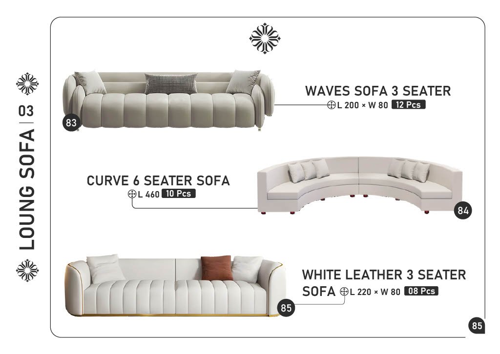 83) WAVES SOFA 3 SEATER โ L200 ร W80 โ 12 pcs 84) CURVE 6 SEATER SOFA โ L460 โ 10 pcs 85) WHITE LEATHER 3 SEATER SOFA โ L220 ร W80 โ 8 pcs