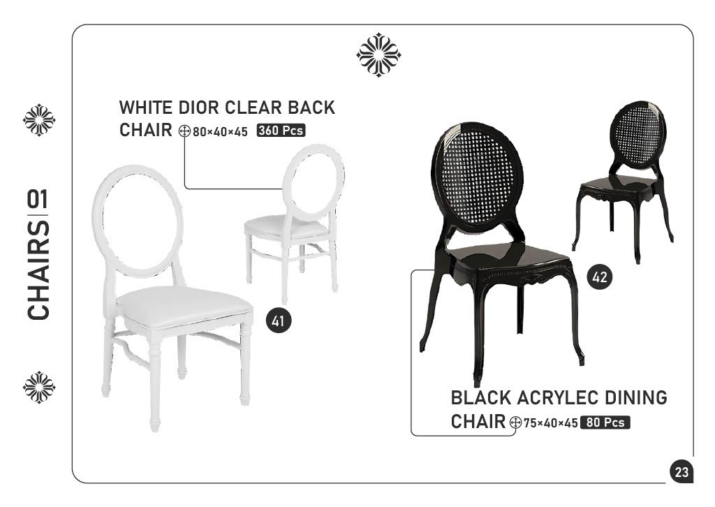 Add to cartElegant and modern designs combining clear Dior-style seating with glossy black acrylic finishes โ ideal for weddings, events, and luxury dining spaces.
