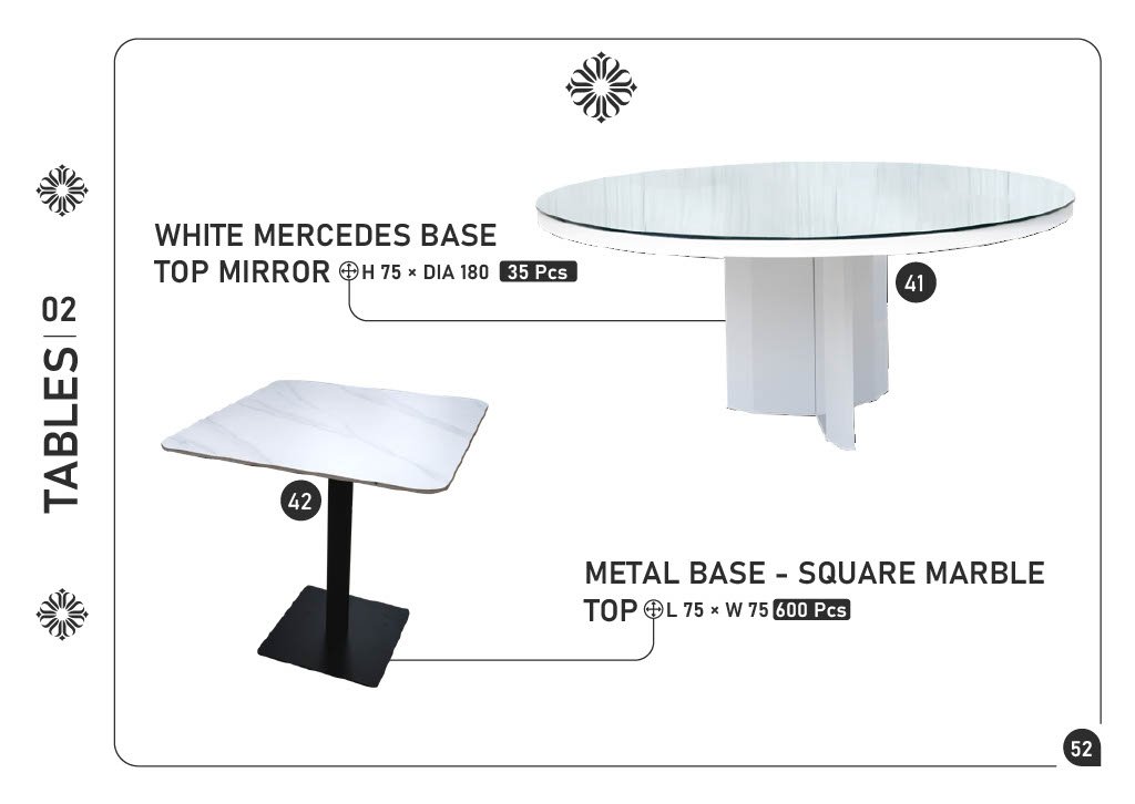 41) WHITE MERCEDES BASE TOP MIRROR — H75×DIA180 — 35 pcs 42) METAL BASE – SQUARE MARBLE TOP — L75×W75 — 600 pcs