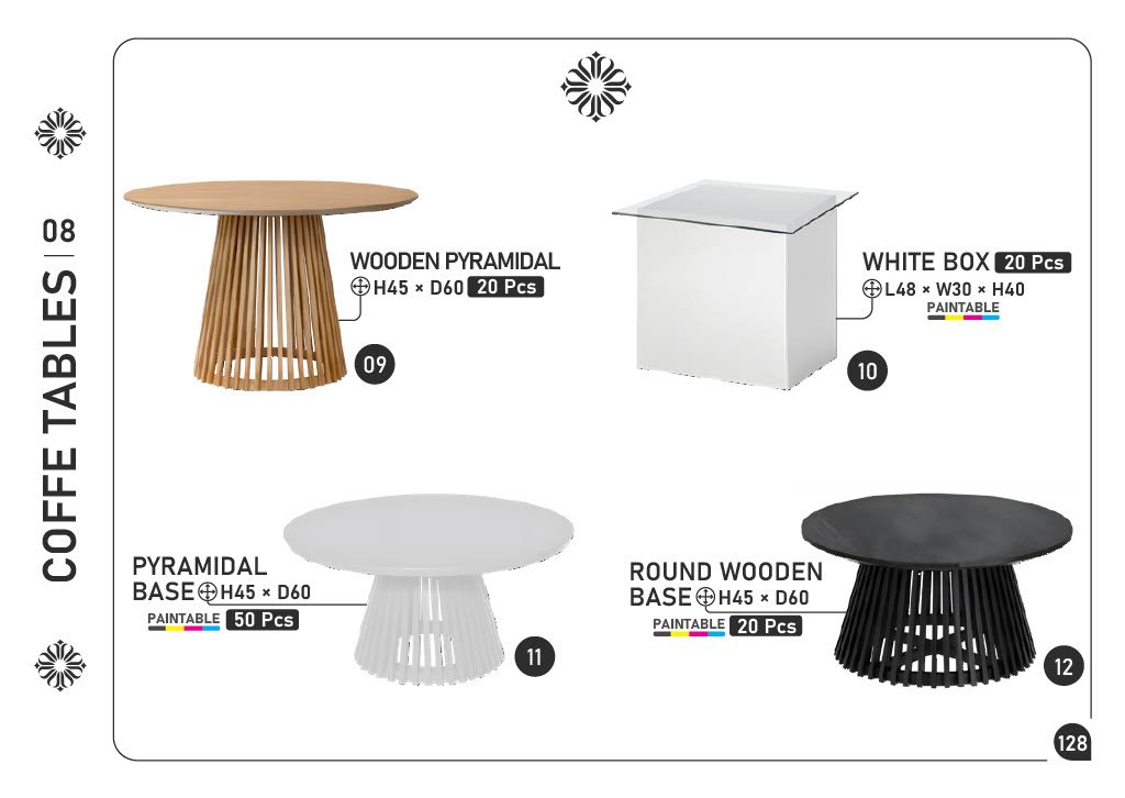 09 Wooden Pyramidal β€” H45 Γ— D60 cm β€” 20 pcs (Paintable) 10 White Box β€” L48 Γ— W30 Γ— H40 cm β€” 20 pcs (Paintable) 11 Pyramidal Base β€” H45 Γ— D60 cm β€” 50 pcs (Paintable) 12 Round Wooden Base β€” H45 Γ— D60 cm β€” 20 pcs (Paintable)